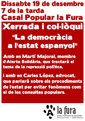 Per poder debatre bé aquest tema, que considerem molt important d’abordar, des del Casal Popular la Fura hem convidat el dissabte 29 de desembre, a les 7 de la tarda, en una xerrada-col•loqui que es farà al mateix casal, a en Martí Majoral, membre de l’organització que tracta casos de repressió política Alerta Solidària, que ens parlarà d’aquest fet i com és utilitzat per part de l’estat per frenar moviments que li són contraris. Per altra banda també tindrem la presència del Carles López, advocat lleidatà, que abordarà el tema de com l’estat utilitza tot el seu entramat, tant institucional com jurídic, per evitar expressions democràtiques que el qüestionen com han intentat fer amb les consultes sobre la independència. Animem a tothom que estigui interessat amb el tema, i sobretot aquells que hagin estat implicats d’alguna manera o d’altra en totes les mogudes dels últims mesos, que vinguin per poder fer encara més enriquidor el debat.